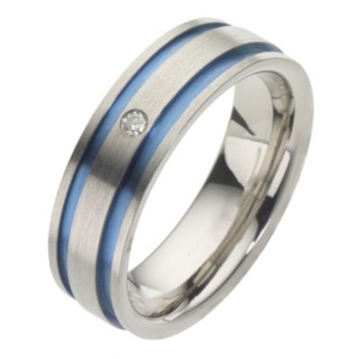 An engagement ring for men, allowing women to propose to their man. Worn on the ring finger of the left hand and then transferred to the ring finger of the right hand for the wedding and happily ever after. This titanium and diamond ring is modern and stylish with blue stripes around the band. Stylish with blue stripes around the band.
